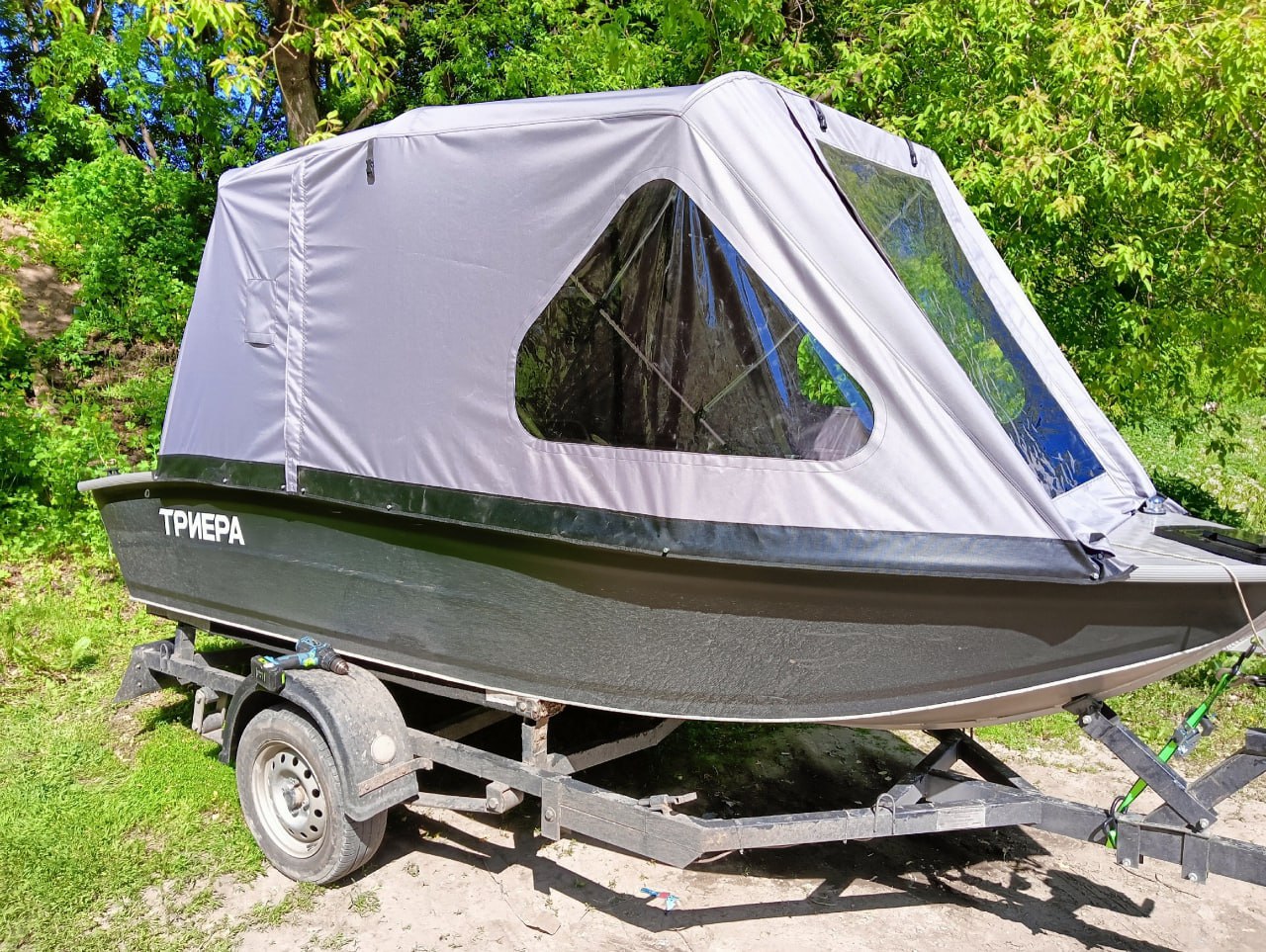 Тент ходовой с задней дверью для выхода к мотору, небольшими боковыми окнами и усиленными краями тента для установки застёжек.