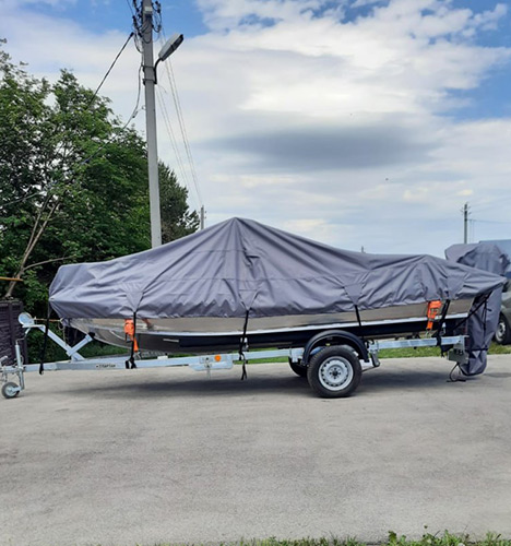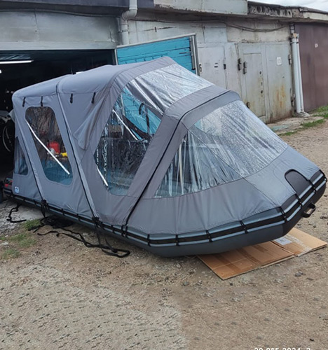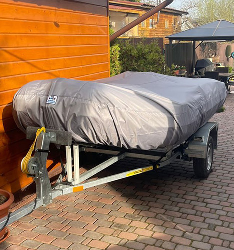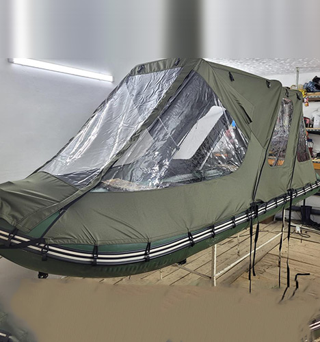 Тент-чехол из ткани повышенной прочности с армированной нитью и двойной сверхпрочной прострочкой межтканевых швов для транспортировки лодки на скорости до 110 км/ч и хранения лодки как зимой так и летом.